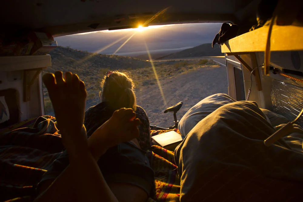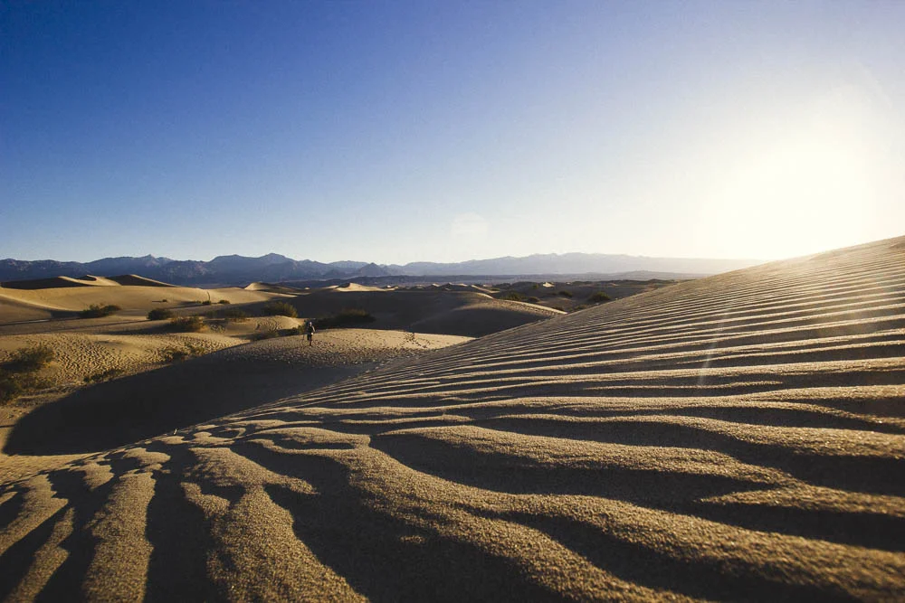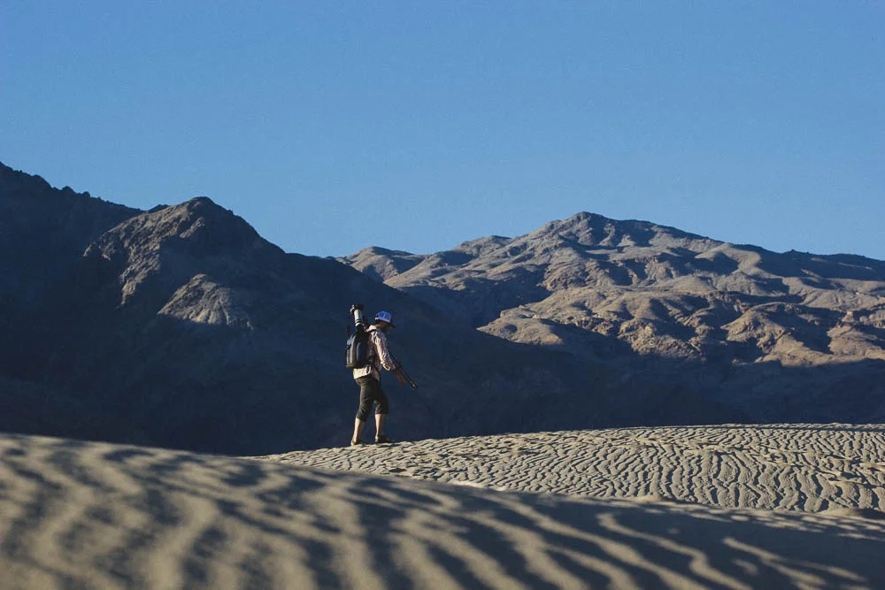 Death Valley is a nutty place. Austere, strange, beautiful, and more than a little hostile feeling. It doesn't feel like a place where humans should be, especially during the heat of the day. It's huge and vast and gorgeous though, with sand dunes, beautiful watercolor-like hillsides in reds, pinks and purples, and surprisingly large mountains. The roads stretch out straight across the desert seemingly to infinity. It's also a huge National Park so there's some pretty great people watching:) We stayed in the valley for a couple of nights and hiked in Mosaic Canyon, checked out the Mesquite Flat Sand Dunes at first light, and camped in a canyon full of cactus (cacti?) and desert flowers. It's amazing the diversity of this country we live in!